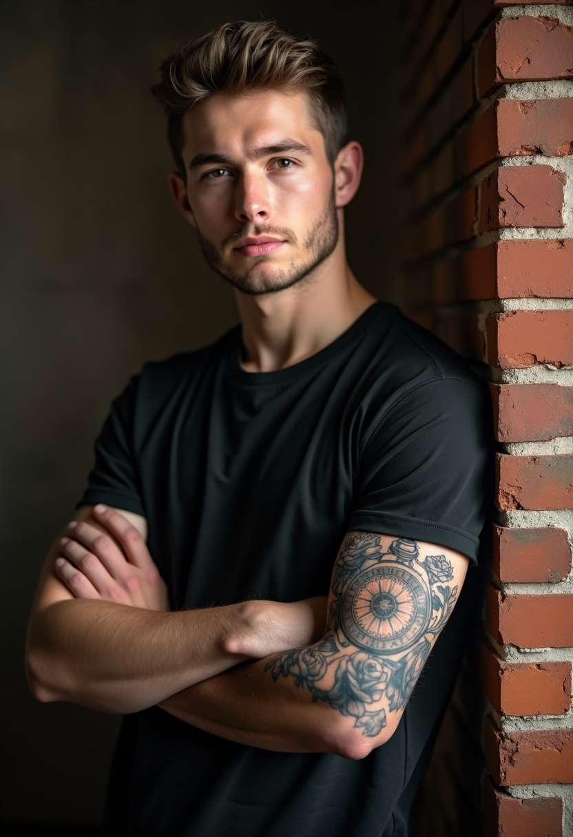 Мужчина в чёрной футболке с закатанными рукавами стоит у кирпичной стены, его руки скрещены, демонстрируя детализированную татуировку с часами и розами на предплечье. Освещение контрастное, подчёркивающее глубину рисунка.
