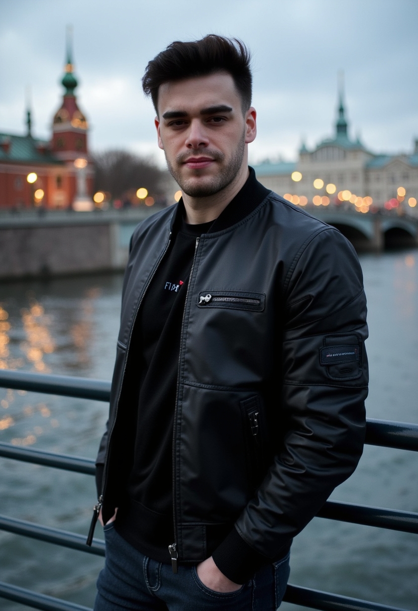 Мужчина в чёрной кожаной куртке и джинсах стоит у берегов Оби, его руки в карманах, а взгляд направлен в камеру. Позади мост Димитрова и вечернее освещение города. Крупный план, создающий ощущение брутальности и городской энергии.