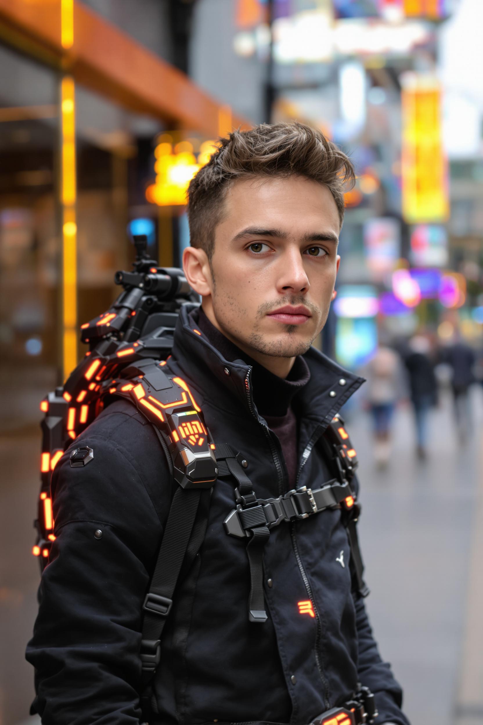 Мужчина в черной куртке с оранжевыми светодиодными вставками, под ней темная водолазка, киберпанк-перчатки с металлическими деталями, на груди подсвеченный рюкзак-гаджет, стильный городской фон с виртуальными экранами, прямой взгляд в камеру, средний план.