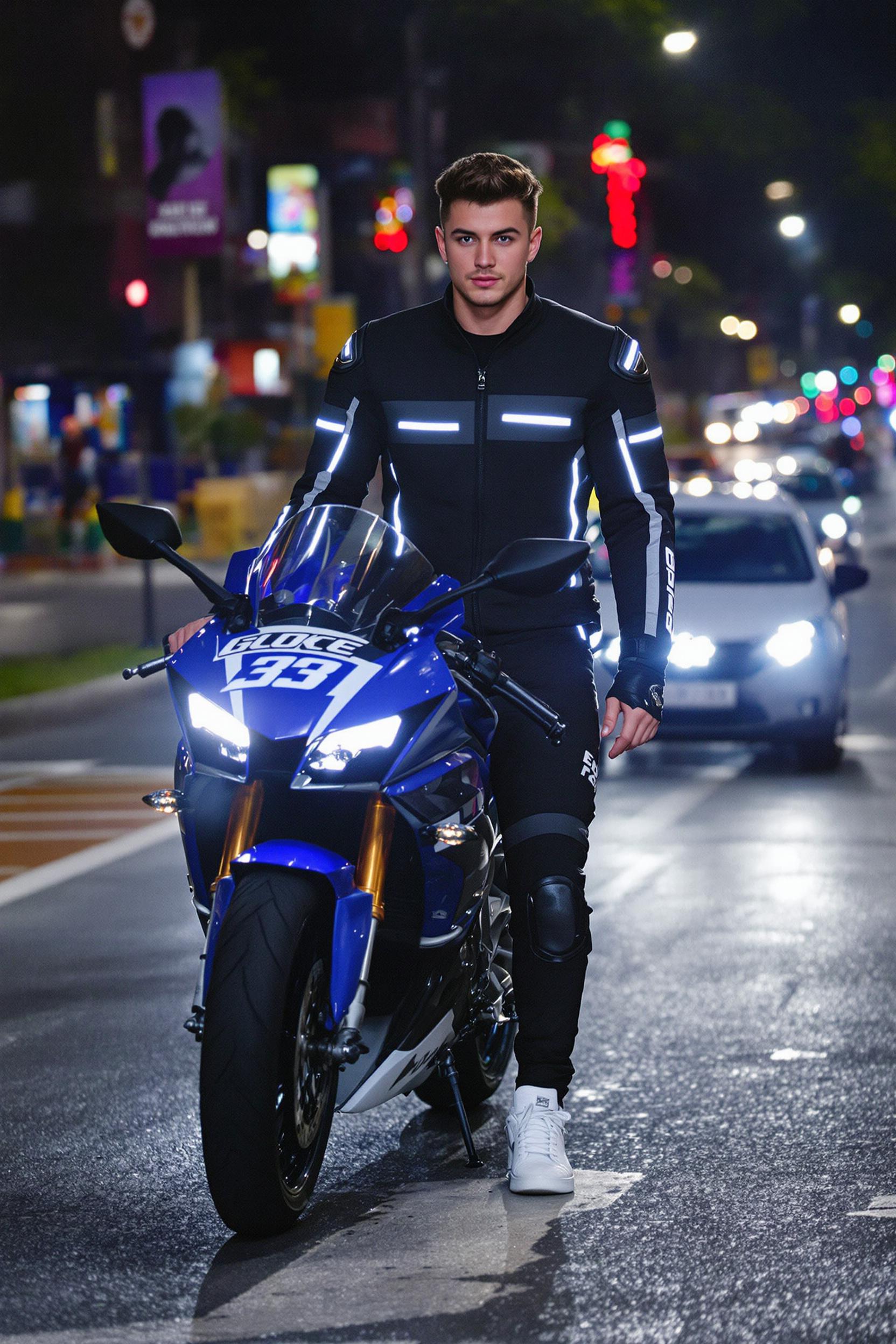Мужчина в черной куртке со светоотражающими элементами, тёмных мотоштаниных и белых кроссовках ведёт спортивный байк на ночной улице с размывающимися фарами. Смотрит прямо в камеру, средний план, атмосфера экшена и скорости.