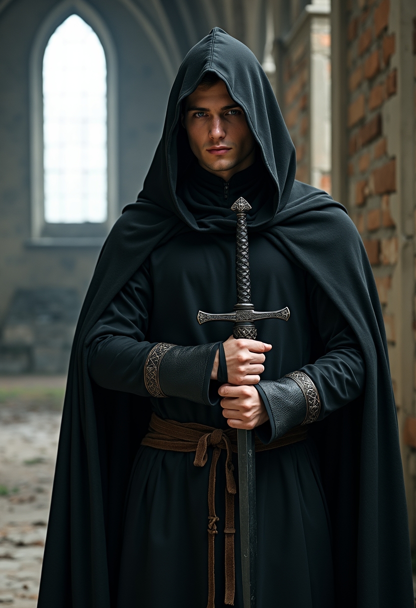 Мужчина в чёрной мантии с капюшоном стоит в разрушенной башне, держит чёрный кинжал с узорами, смотрит прямо в камеру