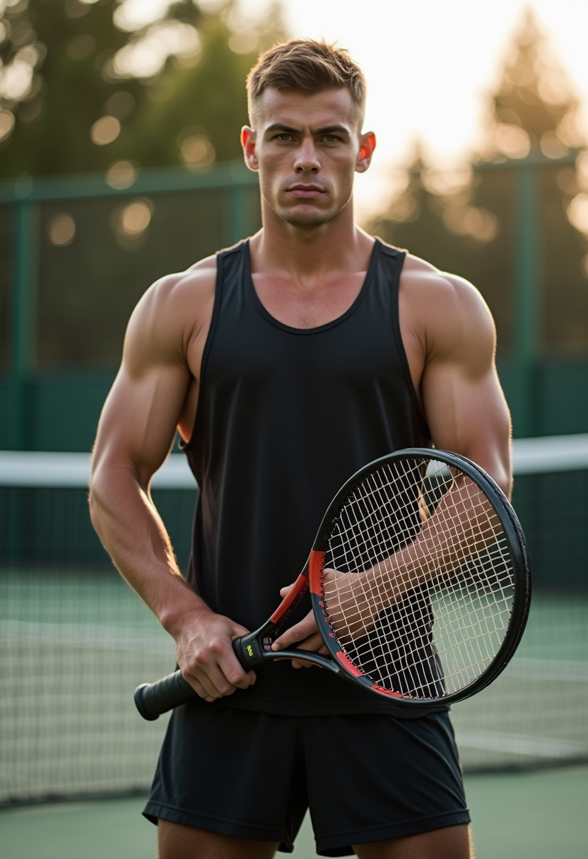 Мужчина в чёрной майке и шортах стоит с ракеткой в руках, его мышцы напряжены. Он смотрит прямо в камеру с решимостью, его кожа слегка блестит от пота. Позади теннисная сетка, солнце создаёт длинные тени. Крупный план, акцент на физической форме и спортивном настрое.