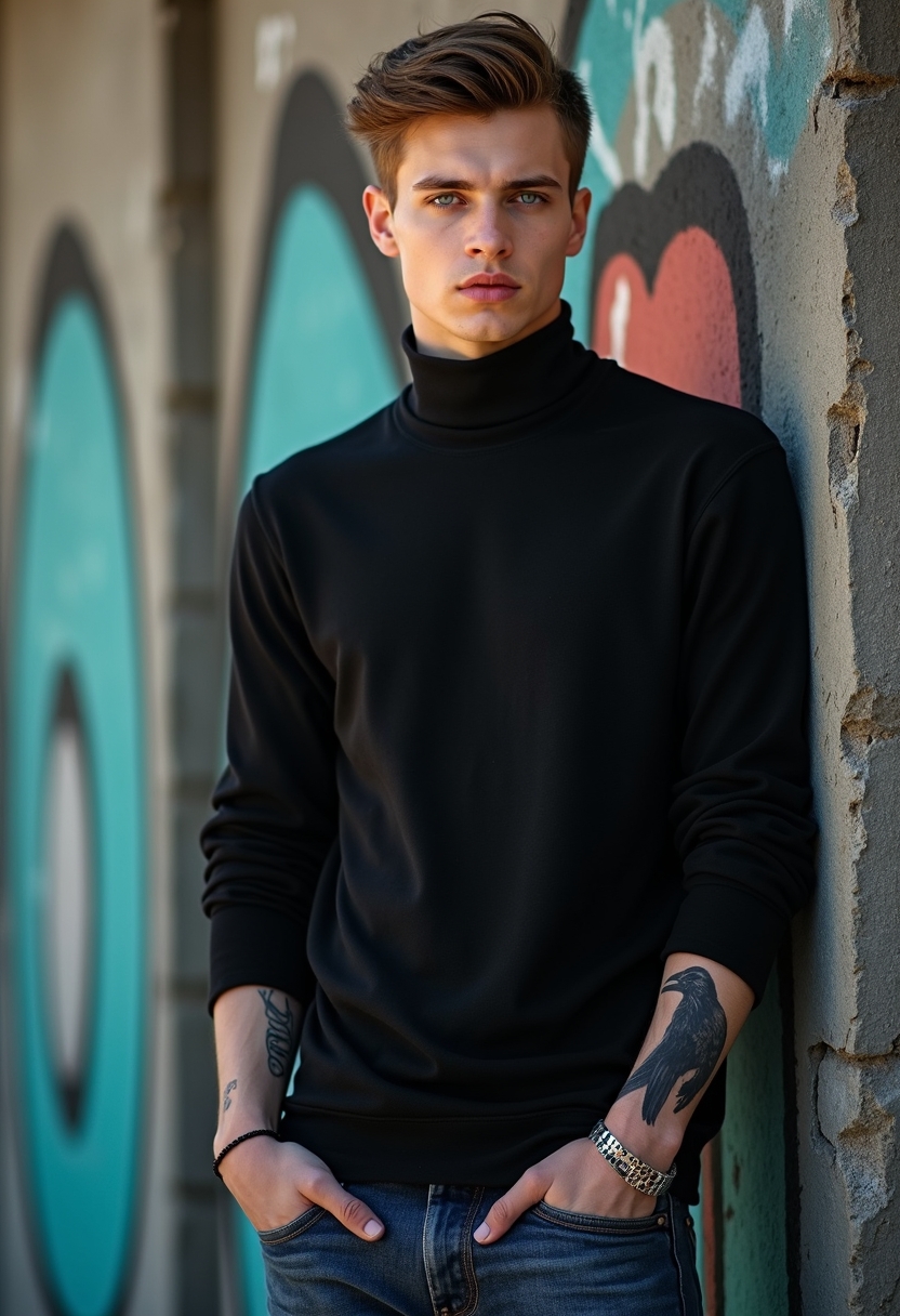 Мужчина в чёрной водолазке стоит на фоне городской стены с граффити, его руки в карманах, а татуировка с изображением ворона видна на руке. Освещение естественное, подчёркивающее урбанистический стиль.