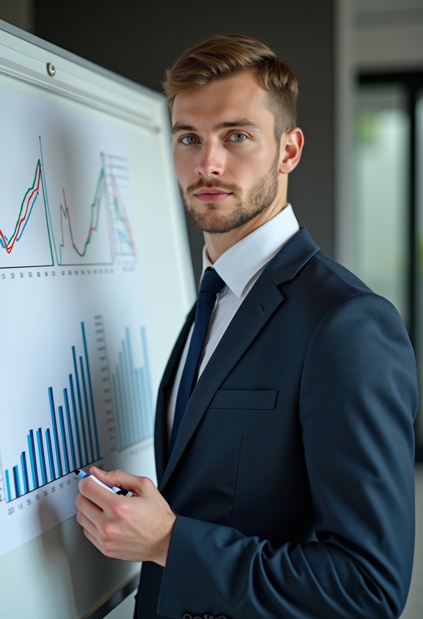 Мужчина в деловом костюме без галстука стоит у флипчарта с графиками, в руке маркер. Он смотрит в камеру, позади — современный офисный интерьер. Крупный план.