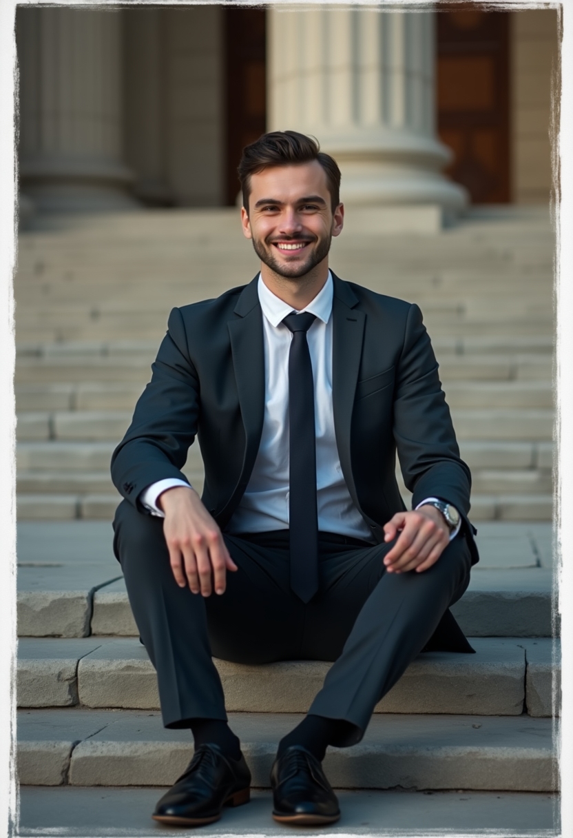 Мужчина в деловом костюме с улыбкой сидит на ступенях исторического здания, за спиной высокие колонны. Фото в стиле Полароид