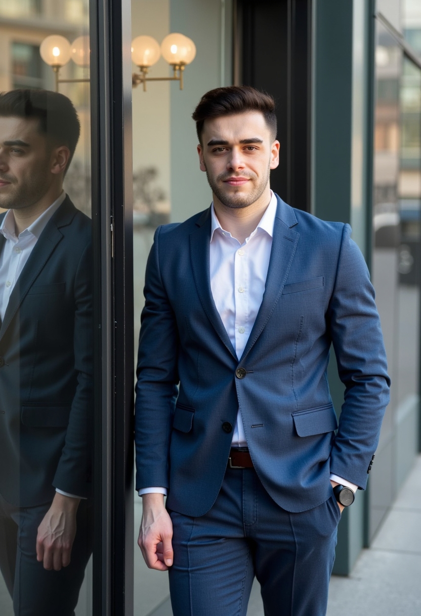 Мужчина в деловом костюме стоит у стеклянного фасада современного здания, смотрит прямо в камеру, вокруг зеркальные отражения