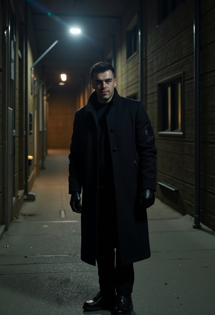 Мужчина в длинном чёрном пальто и кожаных перчатках стоит в пустынном переулке, освещённом редкими фонарями. Его лицо наполовину скрыто тенью, только светлая полоса от фонаря очерчивает линию скул. Освещение мягкое, акцент на глубине теней и одиночестве.