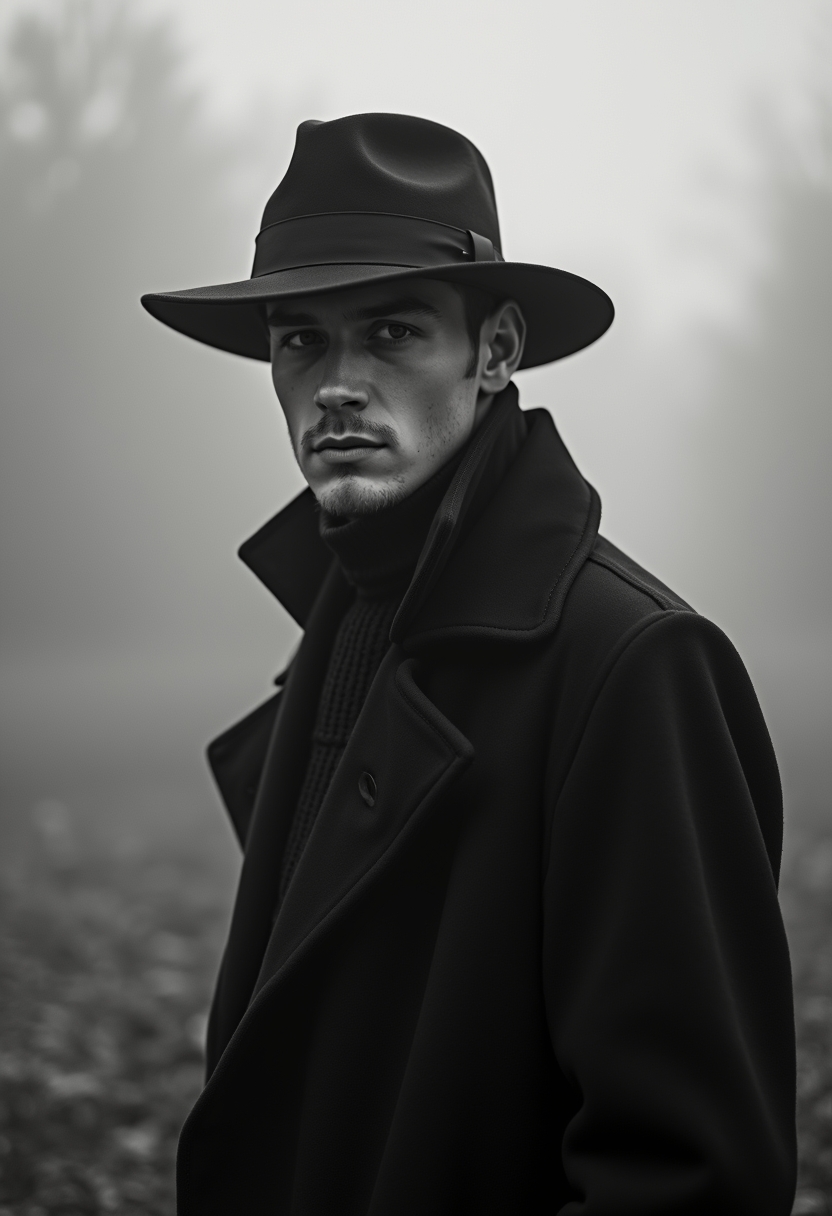 Мужчина в длинном чёрном пальто и шляпе стоит в густом тумане. Его лицо крупным планом, взгляд направлен в камеру, а контуры фигуры слегка размыты. Чёрно-белая гамма, акцент на его загадочности и уверенности.