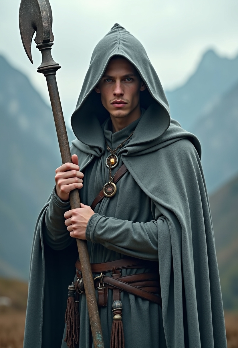 Мужчина в длинной серой мантии с капюшоном стоит на фоне гор, держит посох с сияющим камнем, смотрит прямо в камеру