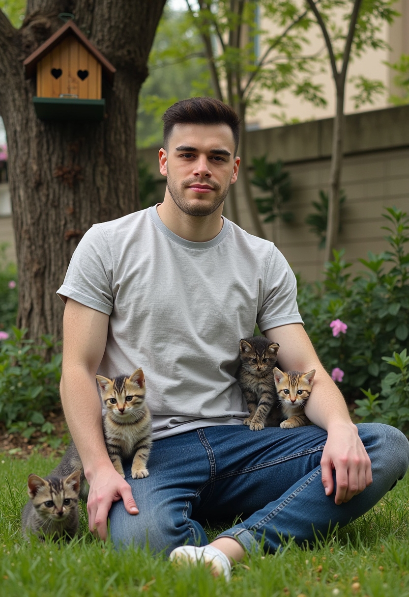 Мужчина в джинсах и футболке сидит на траве, окружённый кучей котят. Фон — старое дерево с птичьим домиком и цветущие кусты.