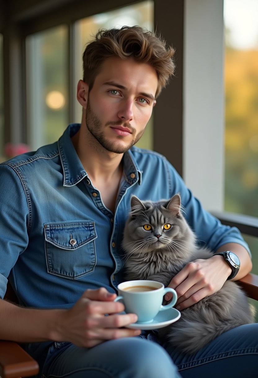 Мужчина в джинсовой рубашке сидит на веранде с чашкой кофе, на коленях уютно устроился пушистый серый кот
