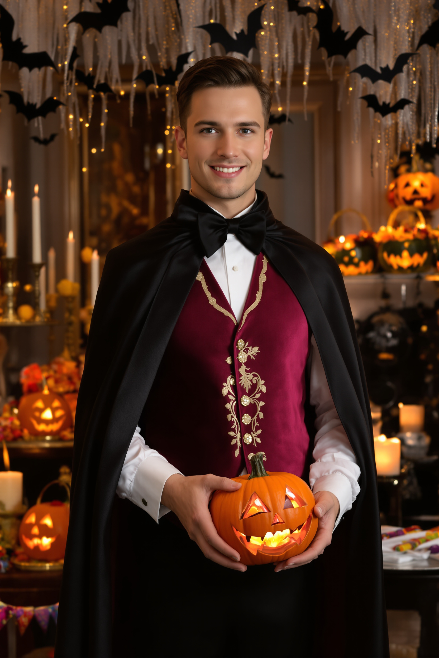 Мужчина в элегантном бордовом жилете с золотой вышивкой и длинном черном плаще с атласной отделкой, стоит в средний план и уверенно смотрит в камеру. В руках держит декоративную тыкву с праздничной резьбой. На заднем плане — гирлянды из летучих мышей, свечи и конфетные корзины для Хэллоуина, яркий свет.