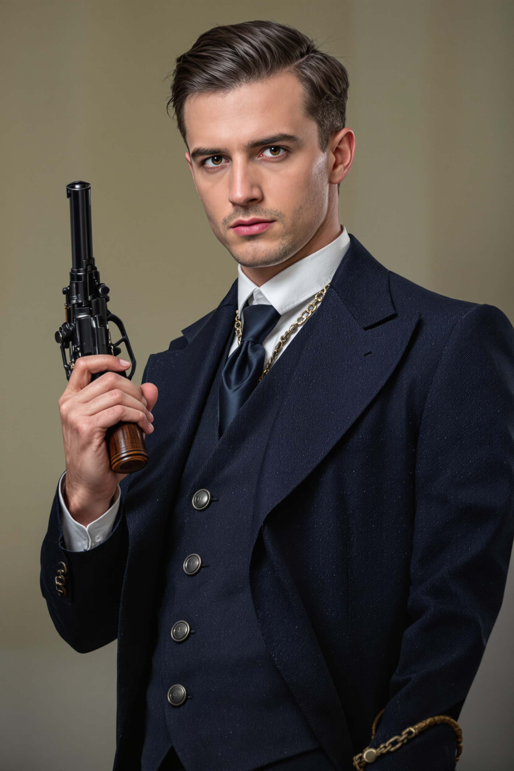 Мужчина в элегантном костюме гангстера 20-х годов: тёмно-синий двубортный пиджак, строгая жилетка, французская белая рубашка, шелковый галстук, карманные часы на цепочке. Он стоит, слегка наклонившись, в руке держит винтажный револьвер, крупный план, уверенный взгляд в камеру.