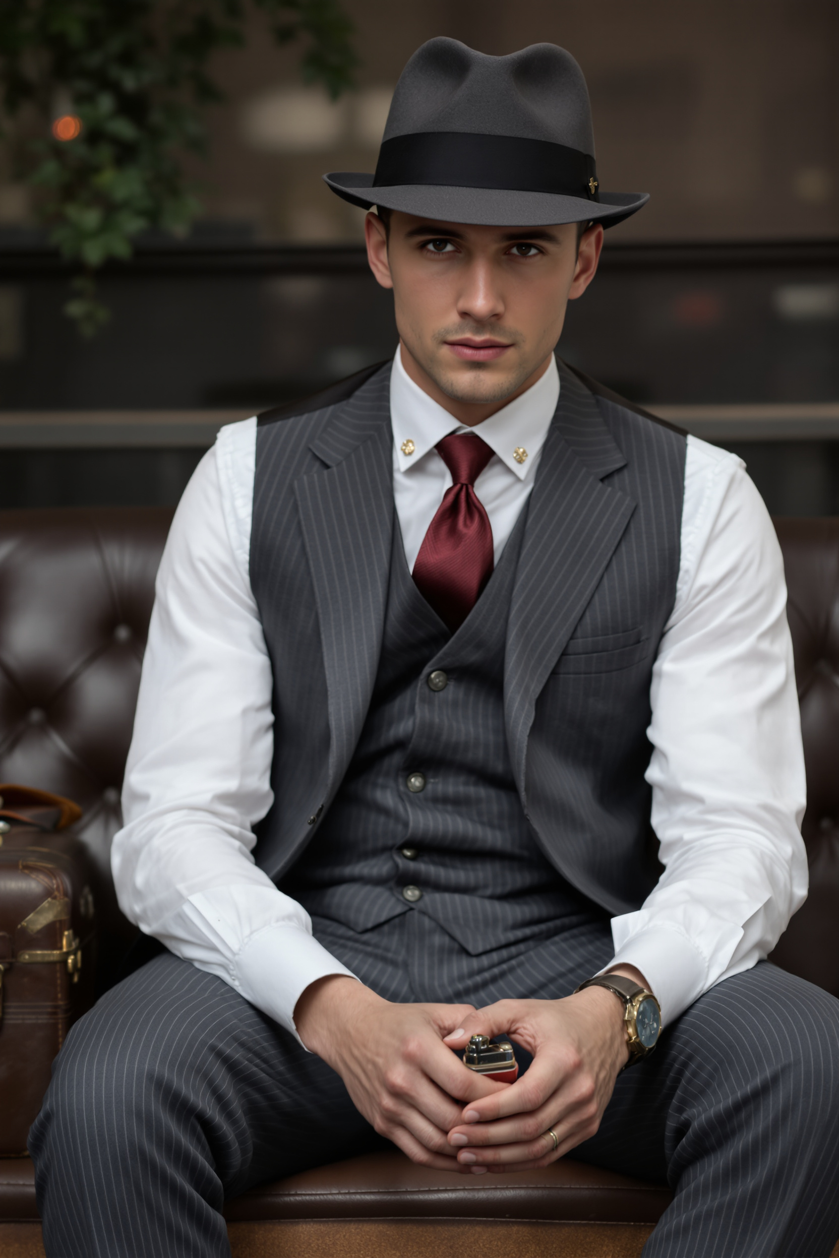 Мужчина в элегантном серо-голубом костюме 20-х годов: прямые брюки со стрелками, приталенный жилет, белая сорочка с винтажными запонками, бордовый шёлковый галстук, классическая шляпа-федора. Он сидит на кожаной скамье у старого чемодана, в руках зажигалка Zippo, уверенно смотрит в камеру.