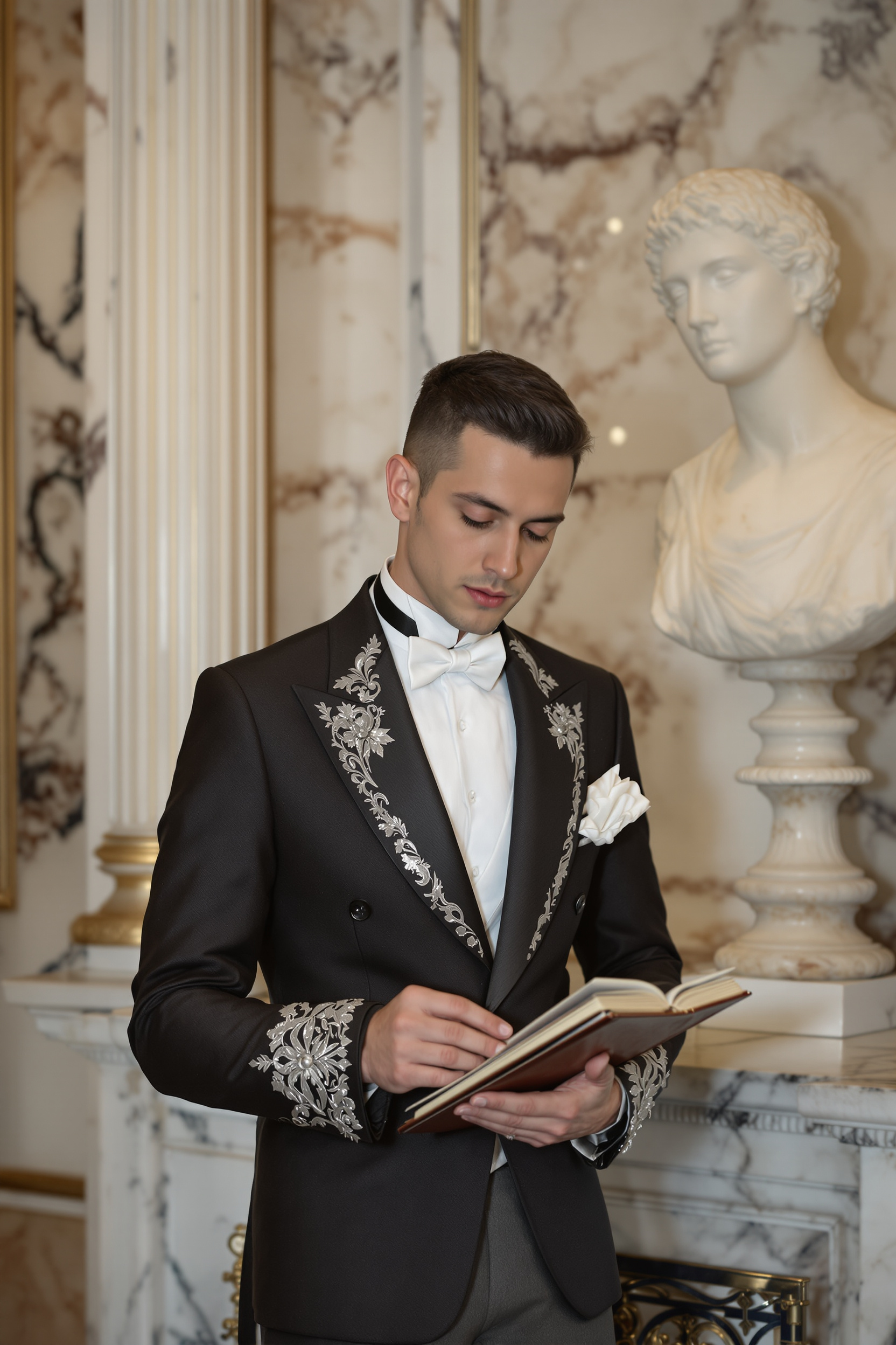 Мужчина в элегантном темно-графитовом жакете с вышитыми серебром лацканами и шелковым белым платком в нагрудном кармане стоит у старинного мраморного бюста, аккуратно листает кожаный альбом и смотрит в камеру. Вокруг изысканный мраморный интерьер.