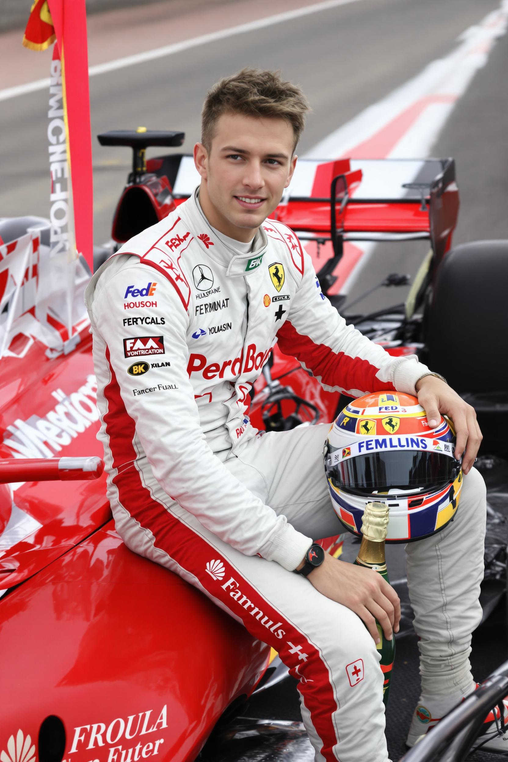 Мужчина в фирменном бело-красном комбинезоне пилота Формулы 1 с эмблемами спонсоров, сидит на боковом крыле болида, в руках держит шлем и бутылку шампанского, смотрит прямо в камеру, вокруг блестящий асфальт трассы и победные ленты.