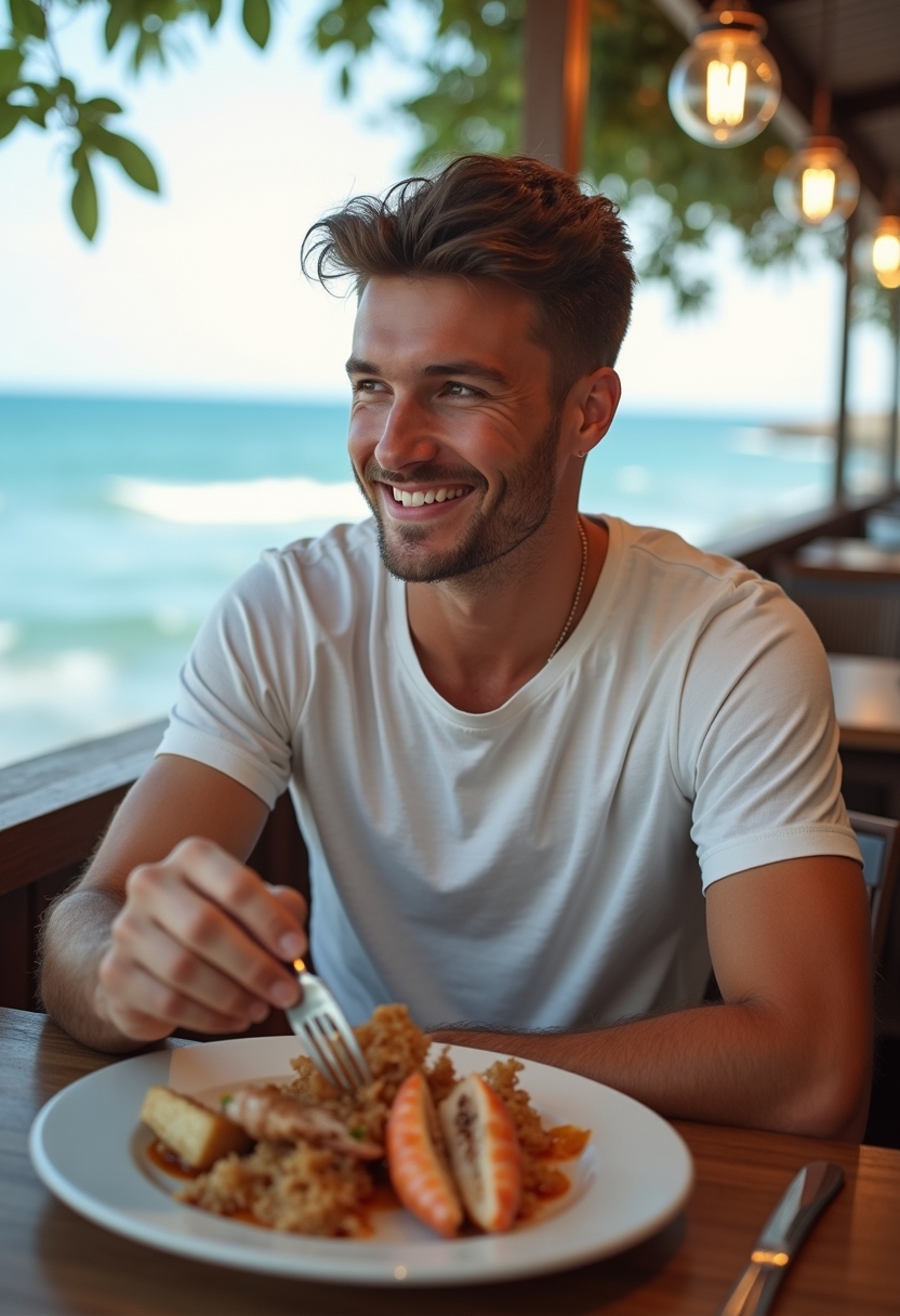 Мужчина в футболке и шортах сидит в кафе с видом на море, его рука держит вилку, а на тарелке свежие морепродукты. Он смотрит в сторону, слегка улыбаясь. Позади уютная терраса и волны, разбивающиеся о берег. Крупный план, создающий ощущение гастрономического удовольствия.