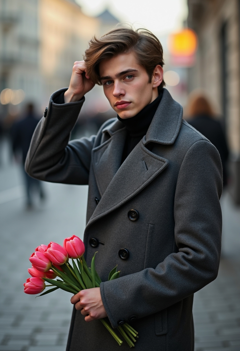 мужчина в графитовом пальто стоит на улице Петербурга, одной рукой держит тюльпаны, другой поправляет волосы, ветер и мягкое рассеянное освещение.