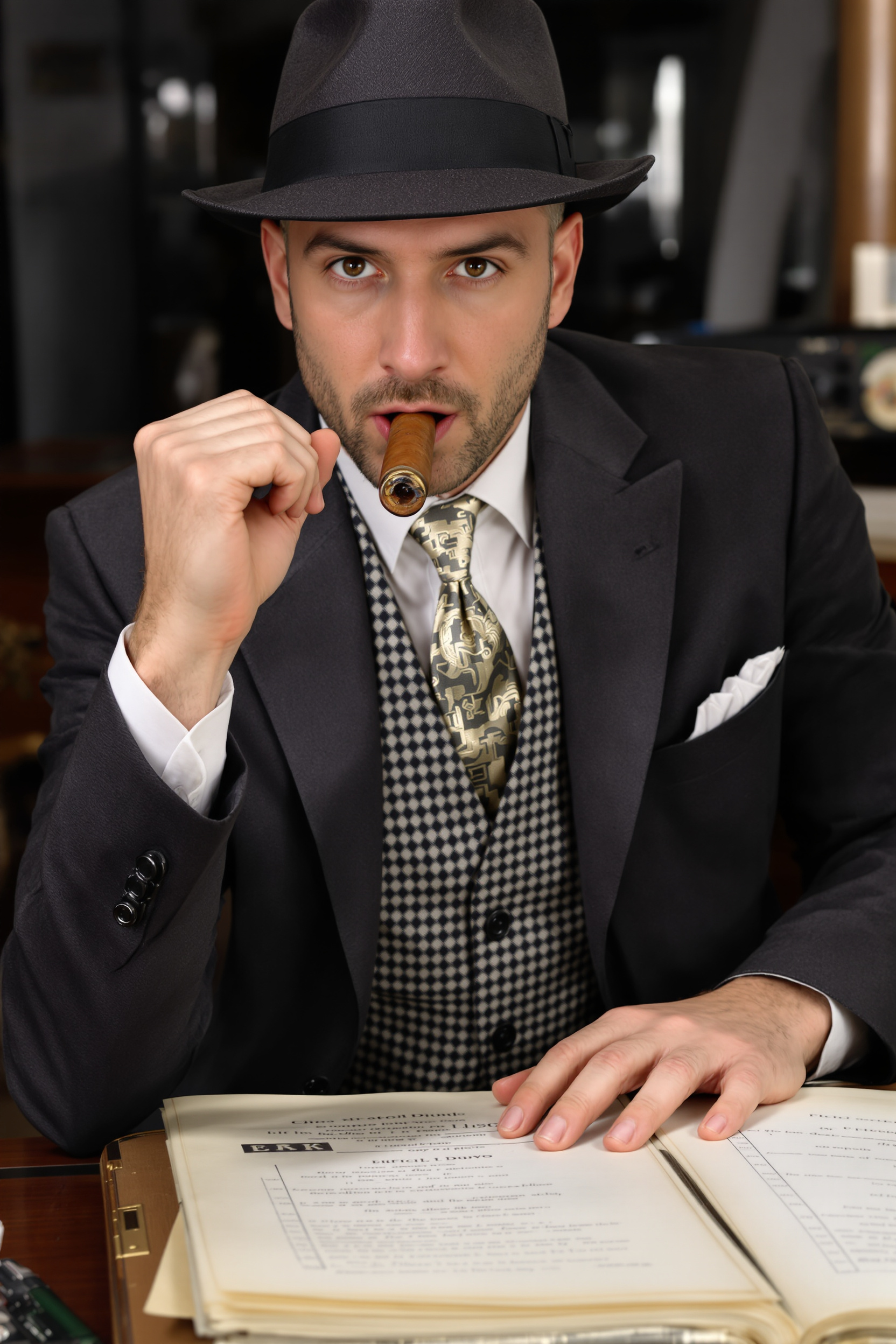 Мужчина в графитовом пиджаке гангстера 1920-х, жилет в мелкую клетку, белая сорочка, шёлковый галстук, тёмная федора. Он наклоняется вперёд, опершись кулаком о старую папку с документами, в другой руке зажата массивная сигара, крупный план, смотрит прямо в камеру.