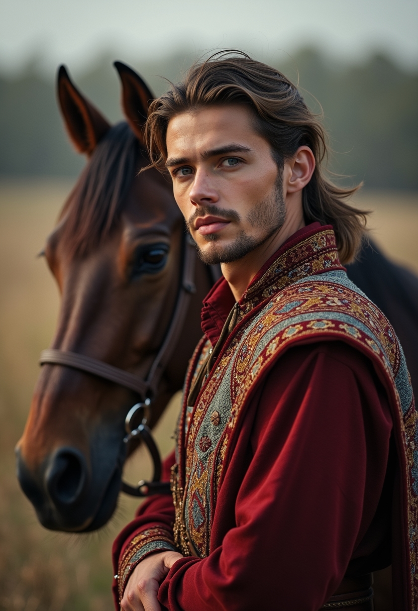 Мужчина в казахском чапане с орнаментом стоит у лошади, положив руку ей на шею. Он смотрит в объектив уверенно и спокойно. Крупный план, атмосфера спокойного достоинства.