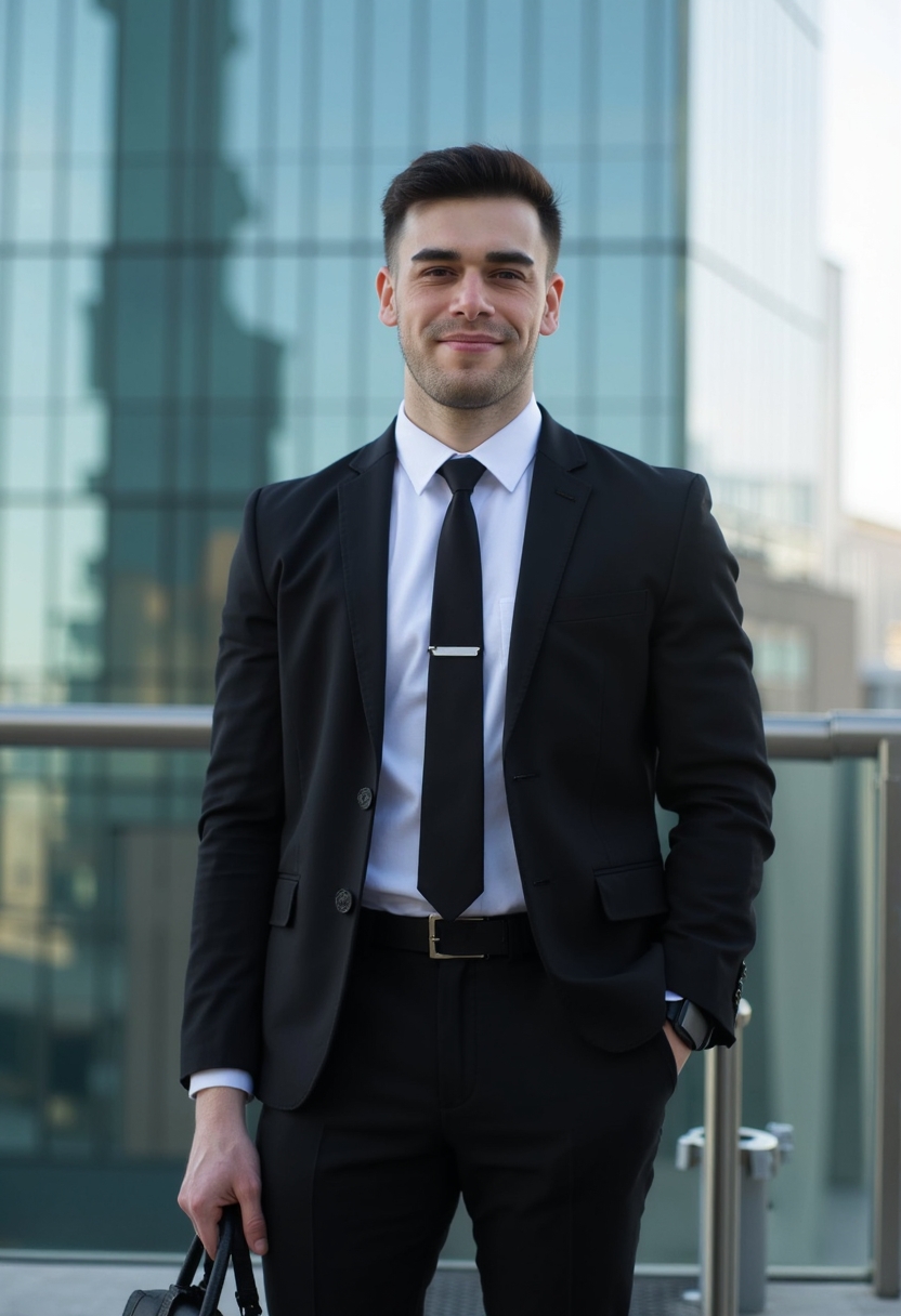Мужчина в классическом чёрном костюме с белой рубашкой и галстуком стоит на фоне высокого стеклянного здания. Он смотрит прямо в камеру с уверенной улыбкой, держа портфель в руке. Позади видны современные архитектурные линии и солнечный свет. Освещение естественное, акцент на его элегантности и...