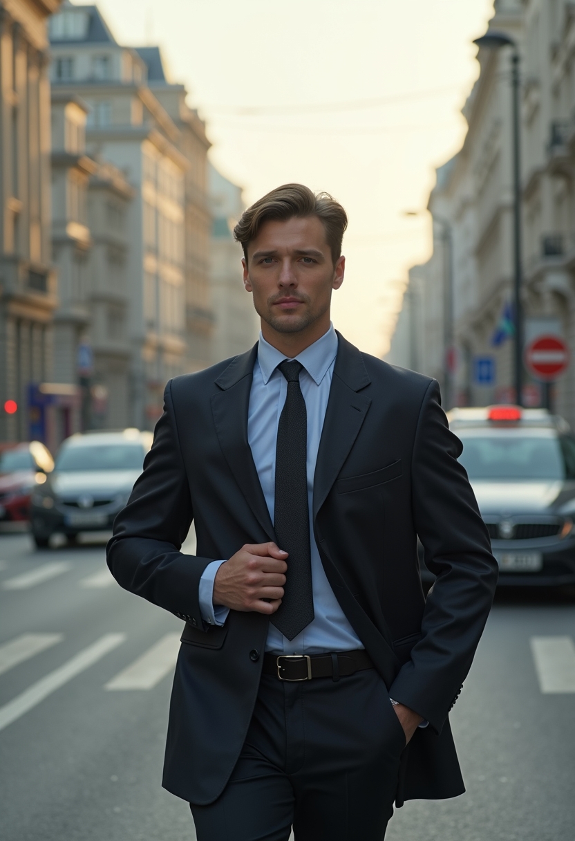 Мужчина в классическом костюме идёт по улице Красный проспект, его рука поправляет пиджак, а глаза направлены в камеру. Позади величественные здания центра города и движение машин. Крупный план, подчёркивающий деловую атмосферу мегаполиса.