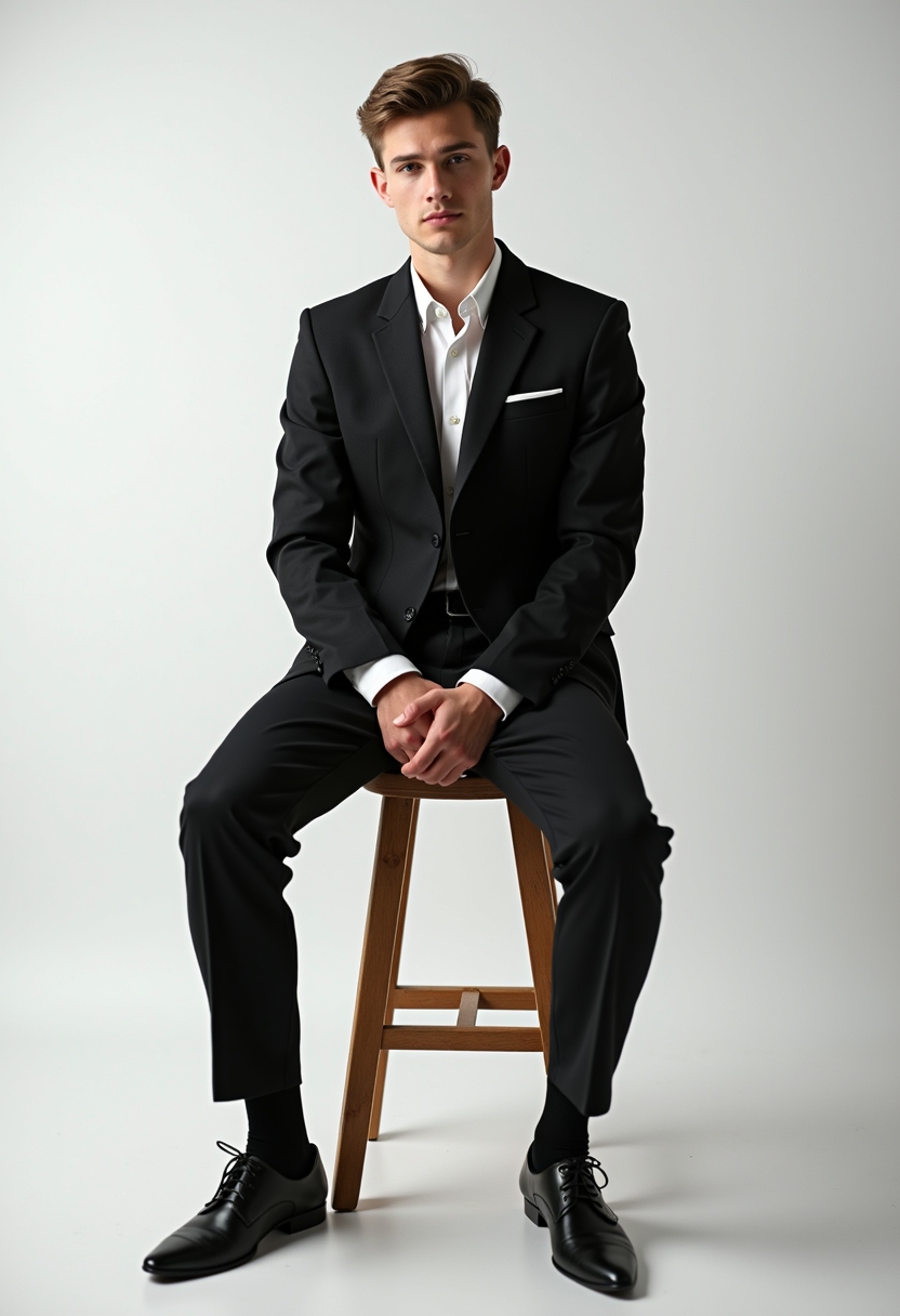 Мужчина в классическом костюме сидит на деревянной табуретке, за спиной белый фон, свет выделяет строгие линии его одежды.