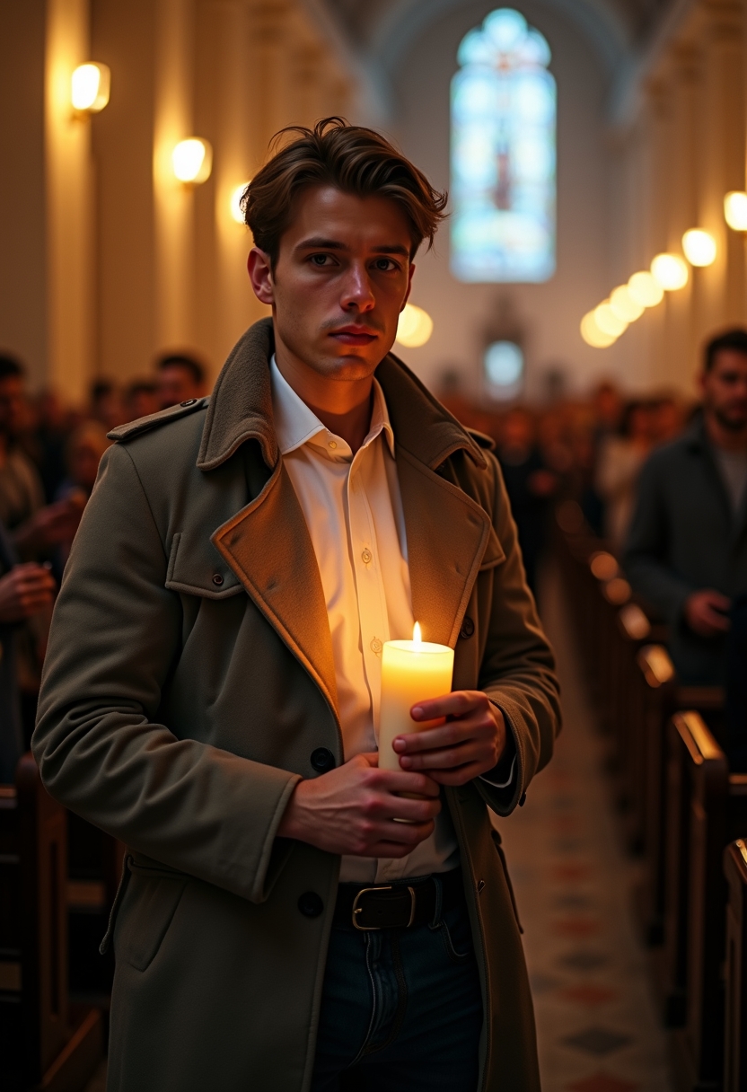 Мужчина в классическом пальто и с зажжённой свечой стоит у входа в храм во время пасхального богослужения. Его лицо освещено мягким пламенем свечи, взгляд направлен в камеру. Позади толпа верующих и церковные огни. Крупный план, акцент на духовности и теплоте праздника.