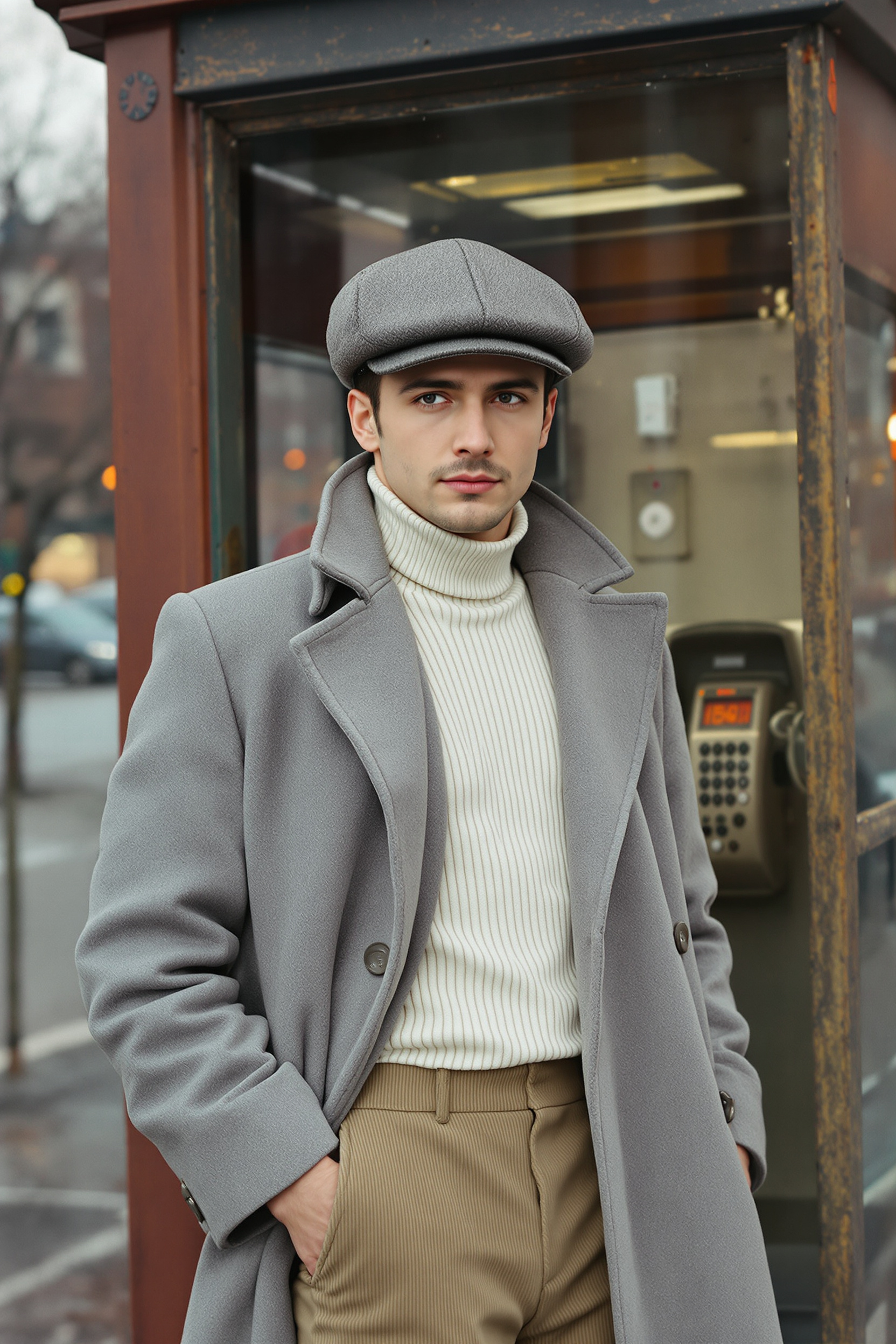 Мужчина в классическом сером пальто с крупными лацканами, под пальто светлый свитер с высоким воротом и вельветовые брюки, на голове папаха, позирует у старой телефонной будки возле советского проспекта, средний план, смотрит в камеру, ламповый пленочный свет.