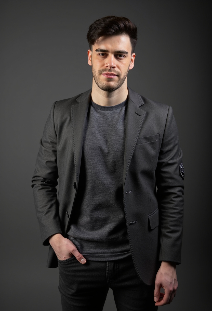 Мужчина в классическом сером пиджаке и рубашке без галстука, на фоне профессионального студийного освещения, смотрит в камеру