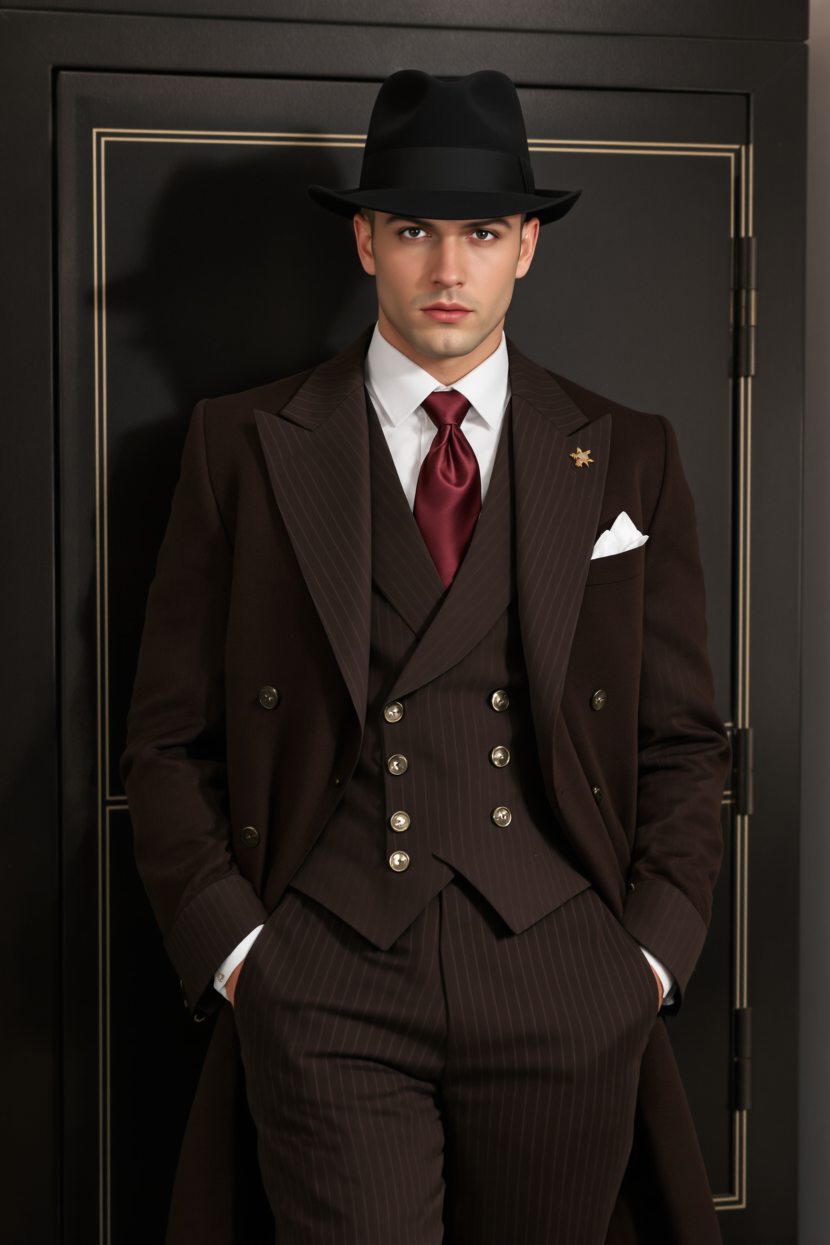 Мужчина в классическом темно-коричневом костюме гангстера 1920-х: длинный двубортный пиджак, жилет, белая рубашка с высокой стойкой, бордовый шёлковый галстук, черная федора. Он стоит, слегка опершись боком на массивный винтажный сейф, рука в кармане, крупный план, твёрдый взгляд прямо в камеру.