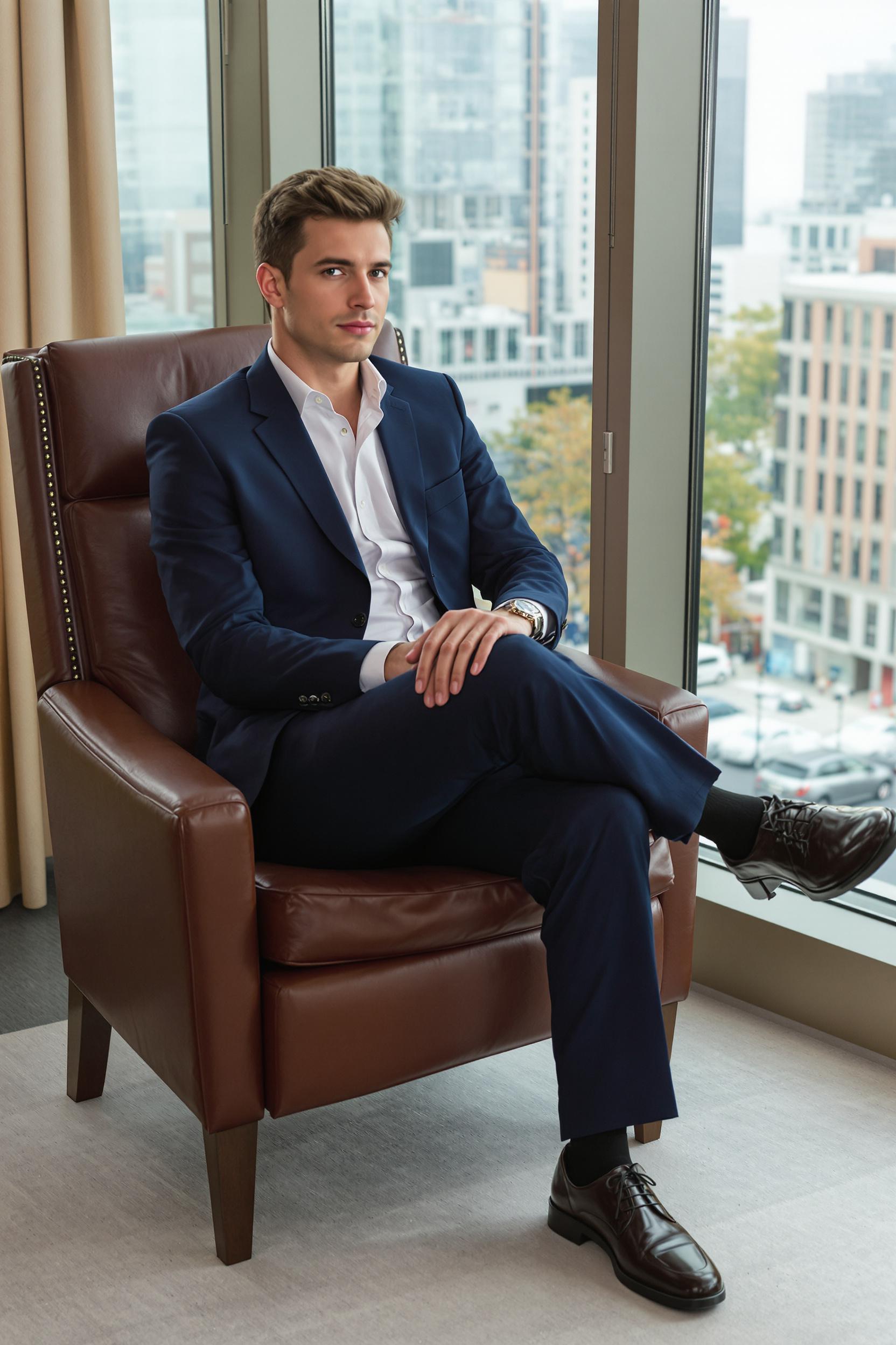 Мужчина в классическом темно-синем костюме и белой рубашке без галстука, сидит на подлокотнике офисного кожаного кресла у окна с видом на город, руки сложены на коленях, корпус развёрнут к камере, уверенно смотрит, средний план, строгий минимализм.