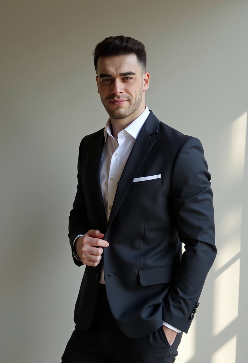 Мужчина в классическом темном костюме и белой рубашке, на фоне с легкой тенью, смотрит прямо в камеру, уверенная поза