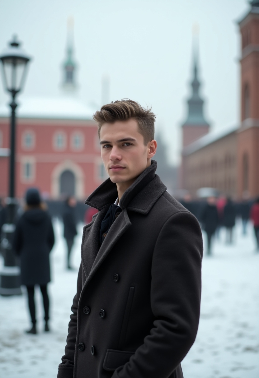 Мужчина в классическом зимнем наряде стоит рядом с главной площадью Казанского кремля, за ним видны здания в неорусском стиле, смотрит прямо в камеру