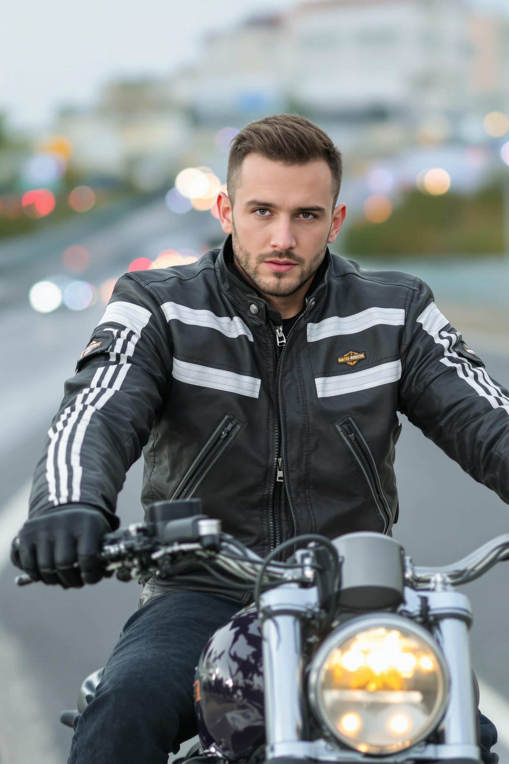 Мужчина в классической косухе с белыми полосами, темных джинсах и массивных байкерских ботинках уверенно ведет Harley-Davidson в движении по трассе, в руках кожаные перчатки. Смотрит прямо в камеру, средний план, эффект динамики, фон — размытые дорожные огни.