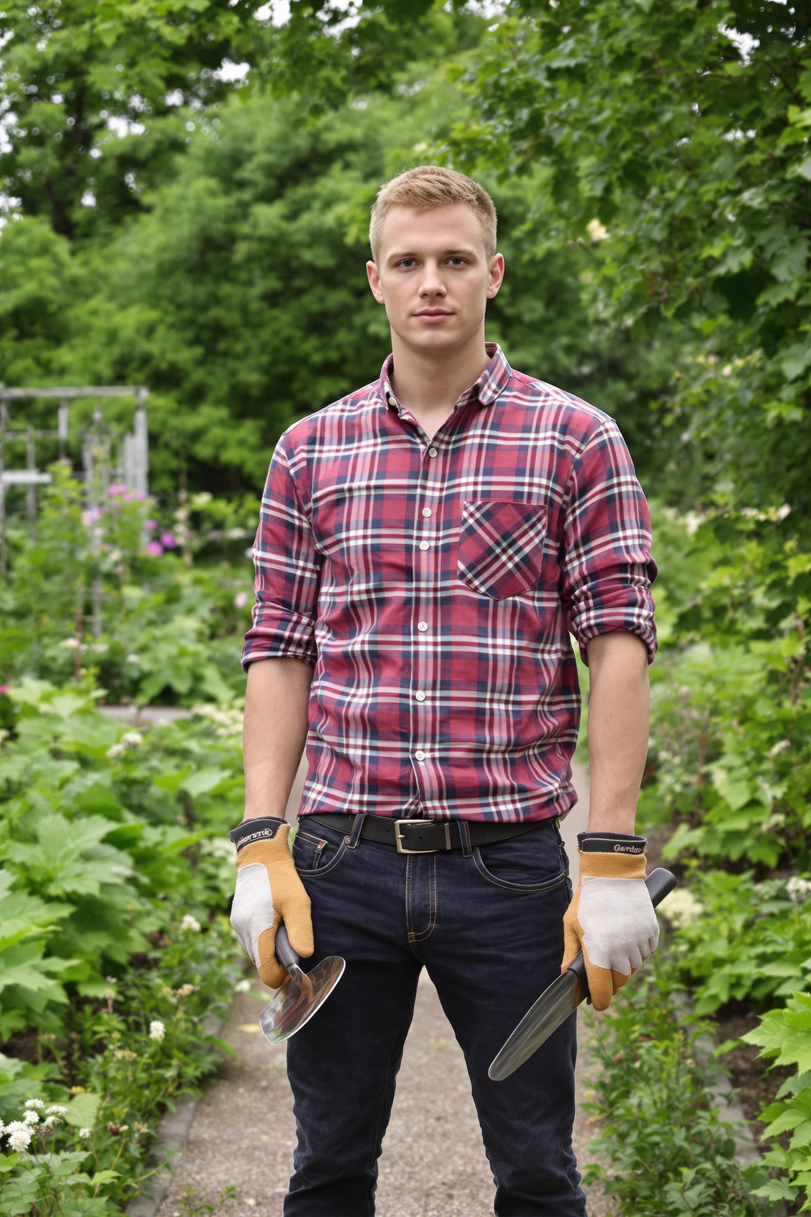Мужчина в клетчатой рубашке и тёмных джинсах стоит на дорожке у дачного огорода, в руках держит садовые перчатки и небольшой совок, спокойно и уверенно смотрит в камеру. Зелёный фон сада, минималистичный деревенский стиль.
