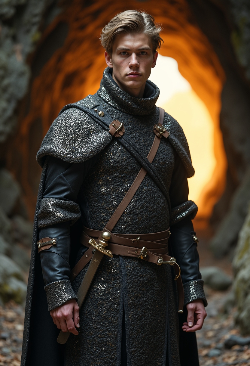 Мужчина в кольчуге и с мечом за поясом стоит у входа в пещеру, за его спиной виден золотой свет, смотрит прямо в камеру