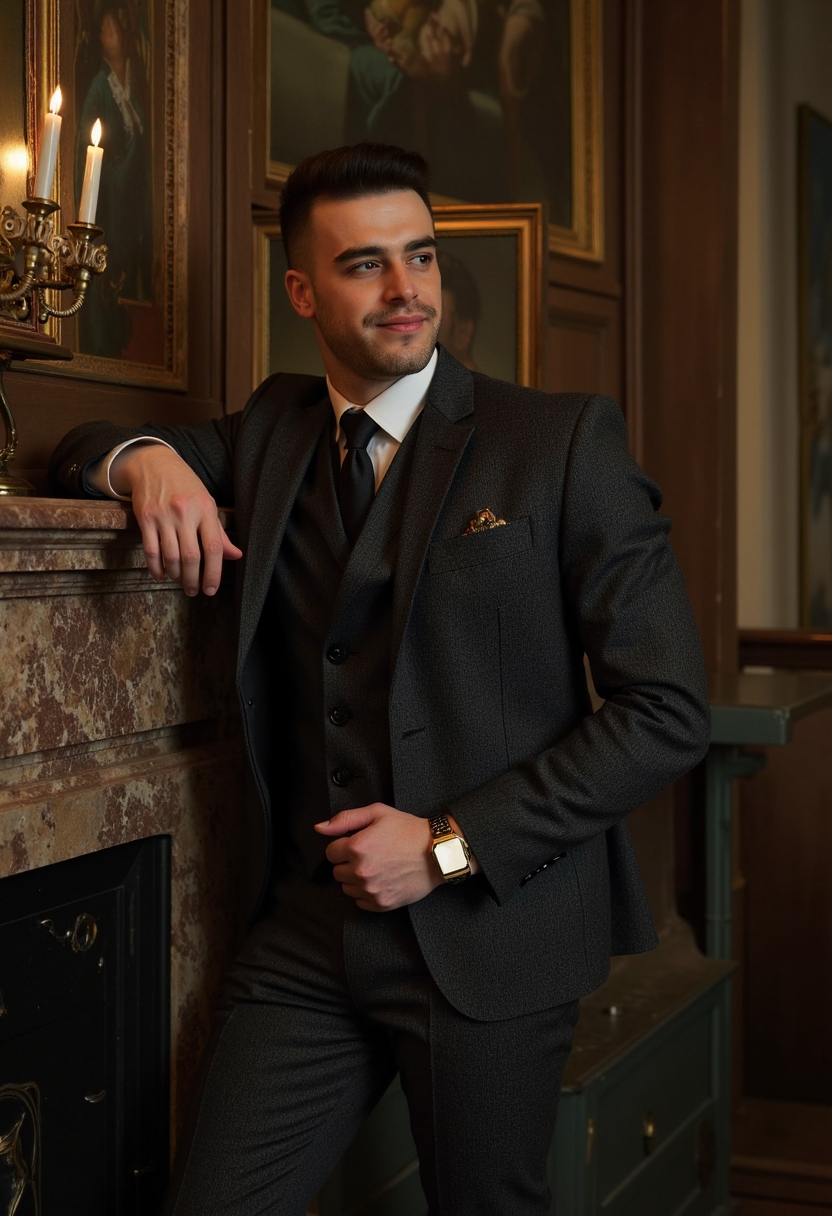 Мужчина в костюме цвета графита с жилетом и золотыми часами на руке стоит у старинного камина с мраморной отделкой. Он смотрит вбок, одной рукой опираясь на каминную полку. Позади видны элегантные картины и элементы декора. Освещение тёплое, акцент на его утончённости.