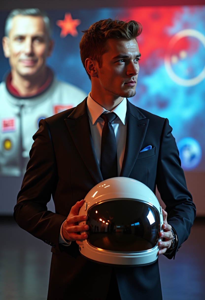 Мужчина в костюме с элементами ретро-футуризма держит в руках глянцевый шлем, на фоне — яркая проекция Юрия Гагарина. Он смотрит в сторону с лёгкой полуулыбкой. Крупный план, создающий атмосферу ностальгии и гордости.
