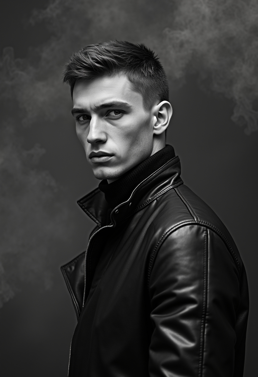 Мужчина в кожаной куртке с короткими волосами стоит на фоне густого тёмного дыма. Его лицо крупным планом, взгляд сосредоточен, губы сжаты. Чёрно-белая гамма, акцент на мужественности.
