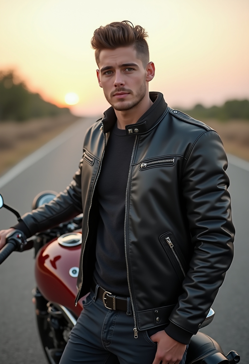 Мужчина в кожаной куртке стоит у мотоцикла на фоне пустынной дороги, смотрит в камеру с уверенным выражением лица.