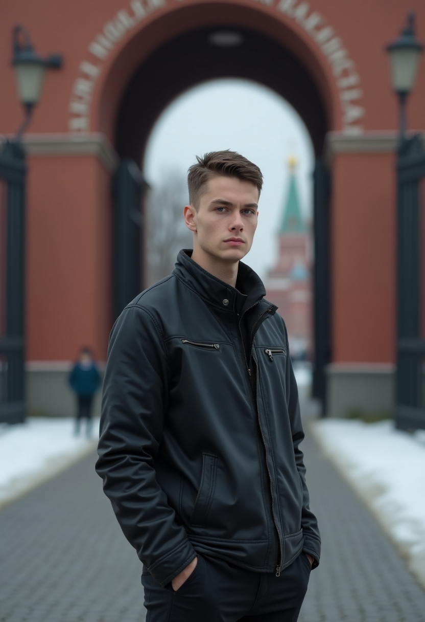 Мужчина в куртке стоит у парадного входа в кремль с массивными воротами и арочными проёмами, смотрит прямо в камеру