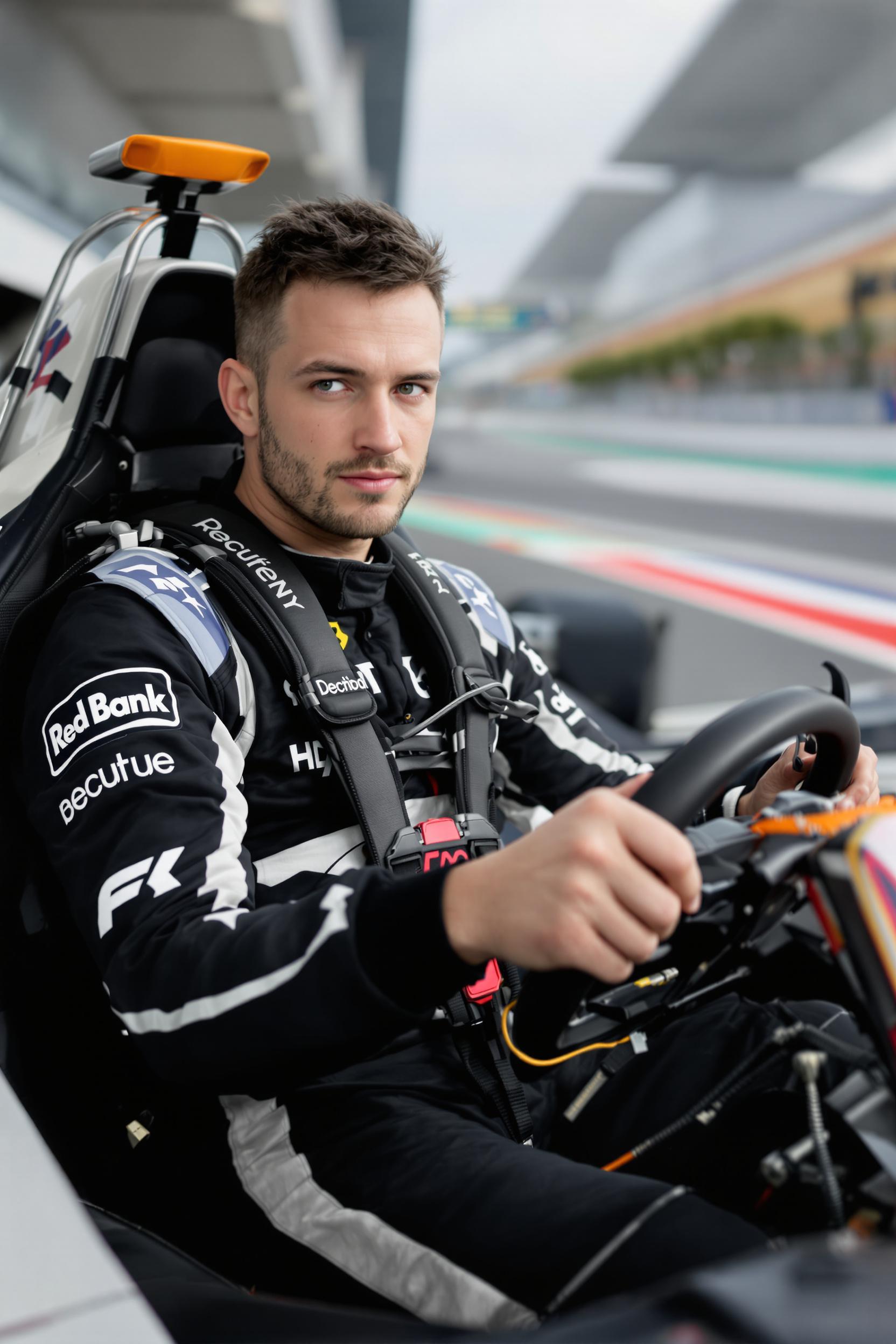 Мужчина в лаконичном чёрно-белом гоночном костюме, сидит в болиде Формулы 1, обеими руками держит руль, смотрит прямо в камеру, позади минималистичный фон трека без лишних деталей, акцент на атмосфере скорости и концентрации.