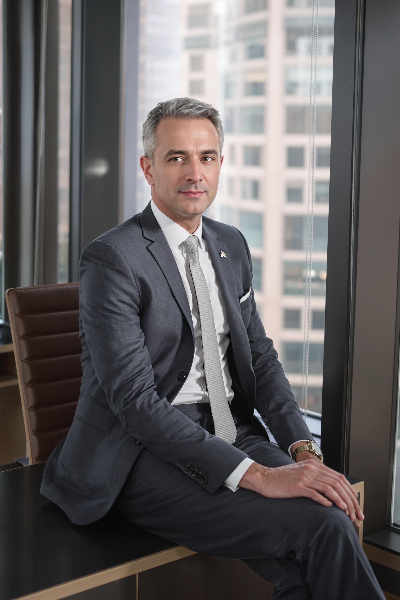 Мужчина средних лет в лаконичном темно-сером костюме и светлой рубашке без галстука, без аксессуаров, сидит боком на кромке офисного стола у окна небоскрёба, руки свободно лежат на поверхности, смотрит в камеру, средний план, современный минимализм.