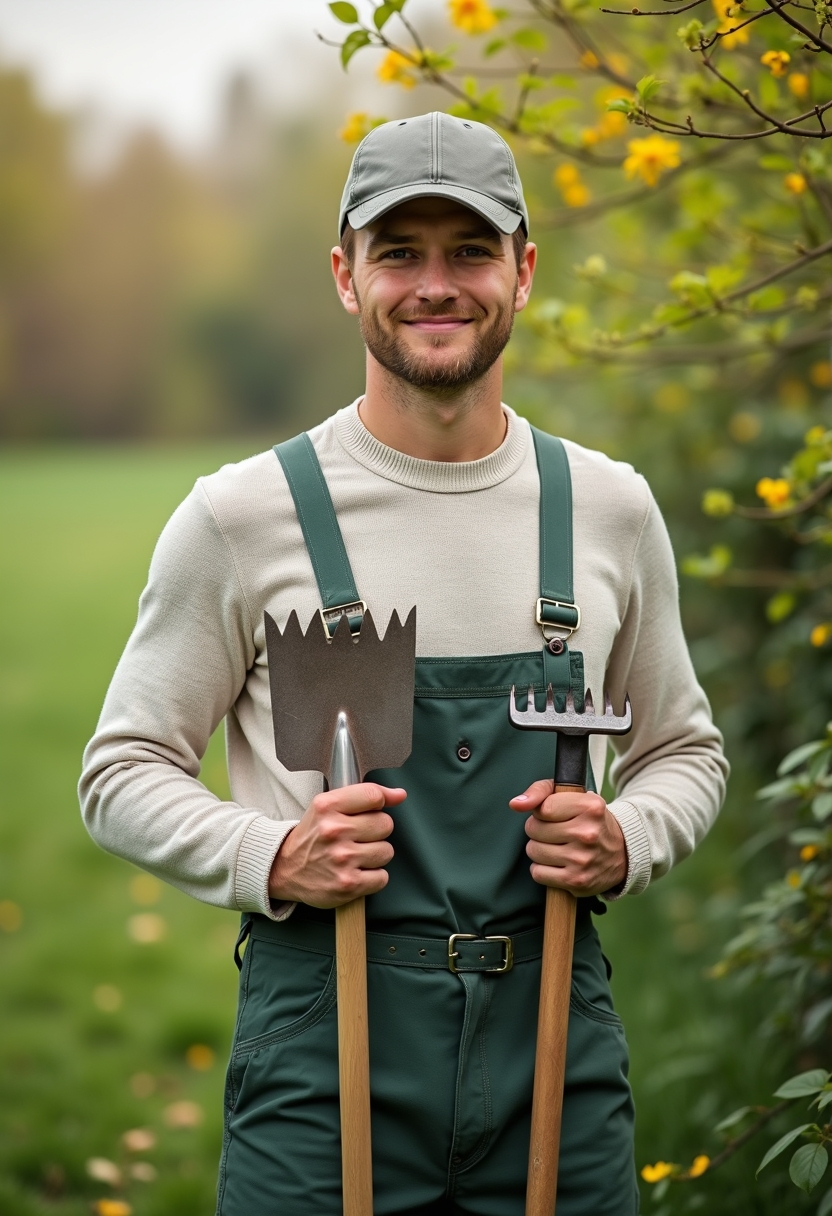 Мужчина в лёгком свитере и кепке стоит на фоне майской зелени, держа в руках садовый инструмент. Он смотрит прямо в камеру, лицо выражает уверенность и хорошее настроение. Крупный план, создающий атмосферу труда и отдыха в мае.