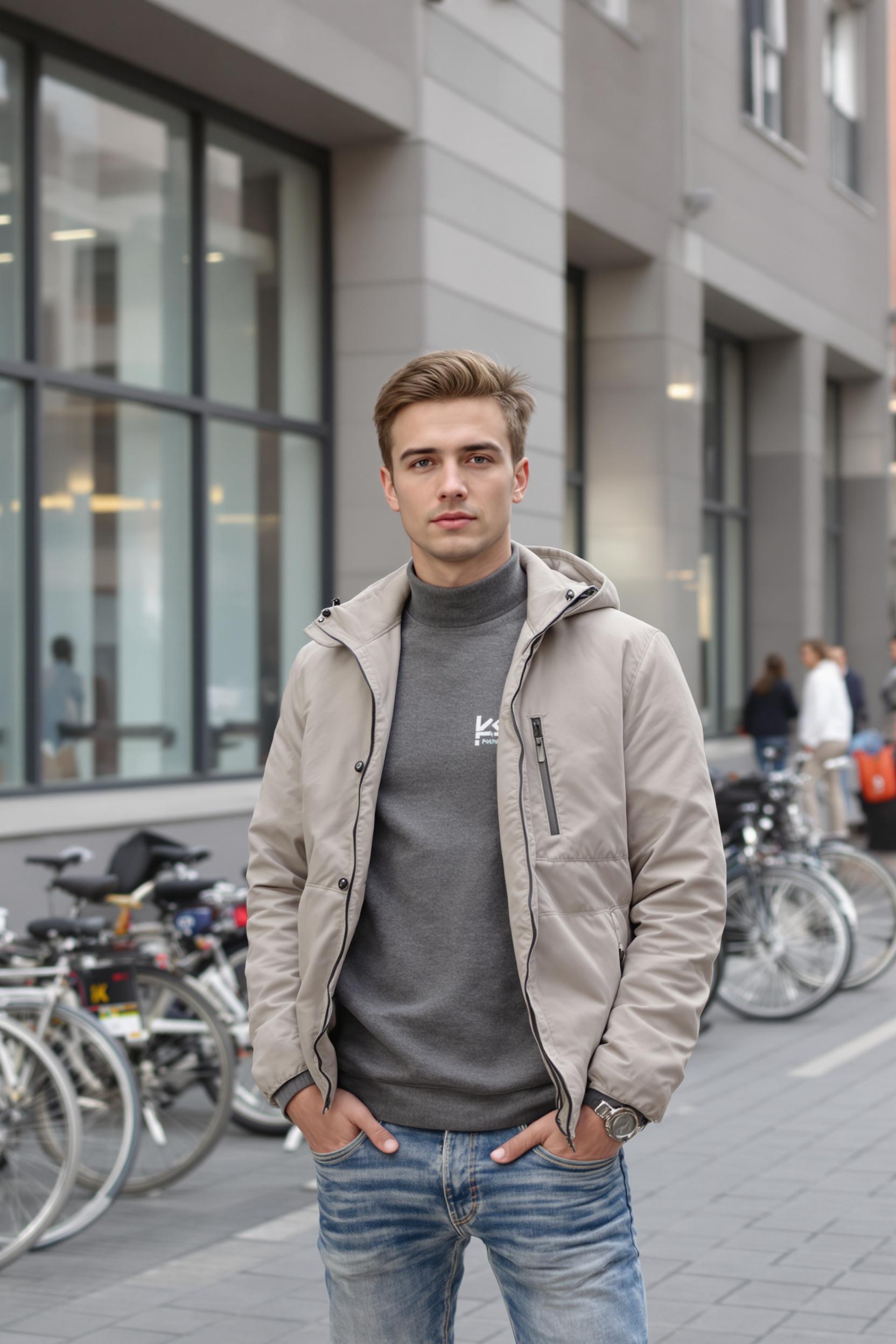 Мужчина в лёгкой куртке и джинсах стоит на фоне городской библиотеки с большими окнами, смотрит прямо в камеру, за его спиной заметны велосипедная парковка и прохожие, дневной свет, городской стиль.
