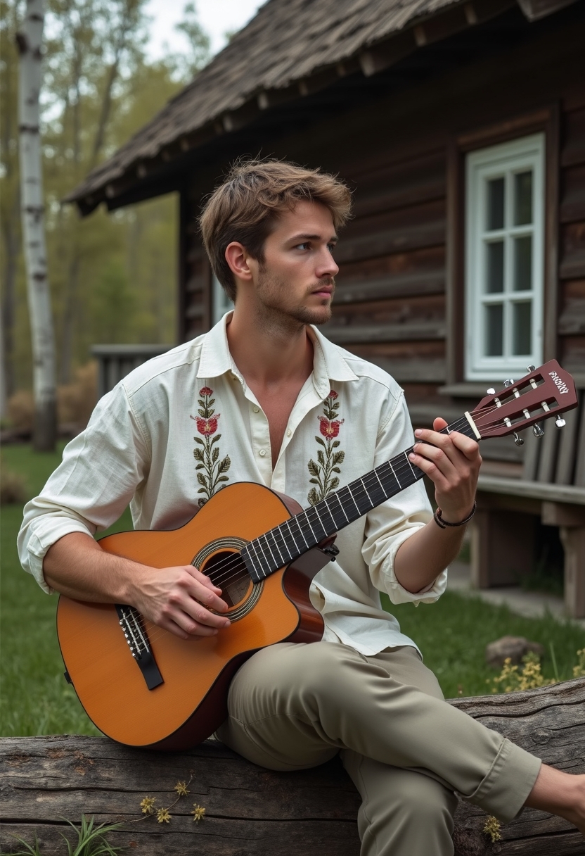 Мужчина в льняной рубахе с вышивкой и штанах сидит на бревне возле деревенского дома. В руках он держит гитару и смотрит вбок с задумчивым выражением лица. Позади видны берёзы и деревянная лавочка. Освещение естественное, акцент на его расслабленности.