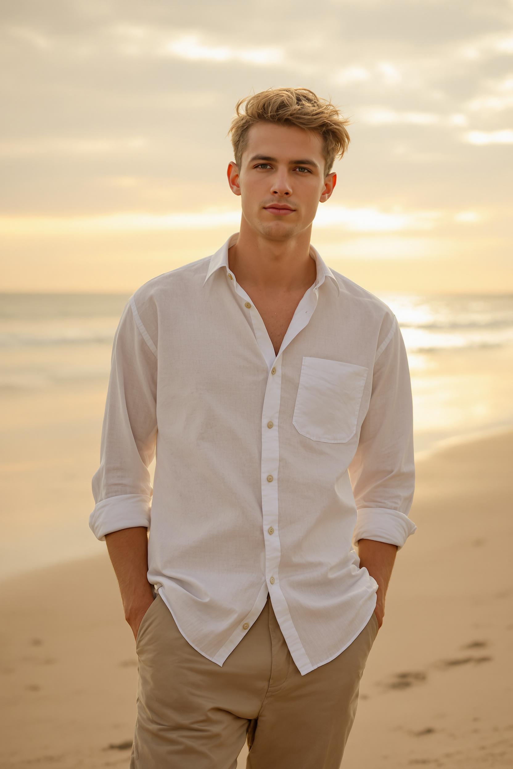 Мужчина в льняной светлой рубашке и свободных бежевых брюках стоит на песчаном пляже, держит руки в карманах, на фоне переливов закатного неба, мягкий свет придает сцене теплые оттенки, он смотрит прямо в камеру.