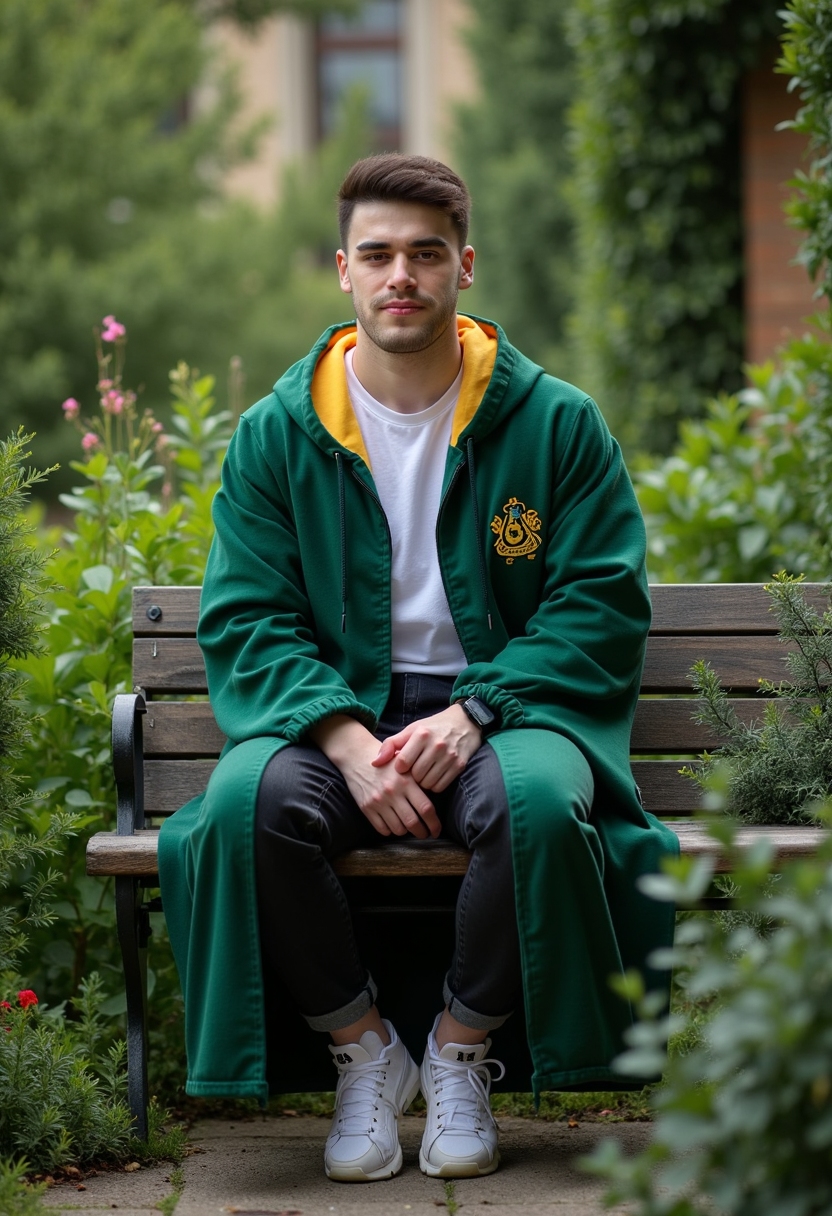 Мужчина в мантии Хаффлпаффа сидит на скамейке в зелёном саду, смотрит прямо в камеру, вокруг магические растения