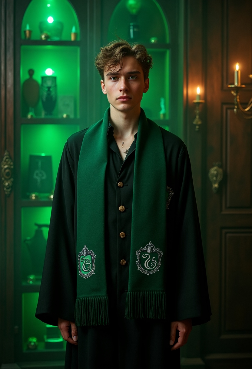 Мужчина в мантии и шарфе Слизерина стоит перед шкафом с магическими артефактами, смотрит прямо в камеру, вокруг зелёный свет